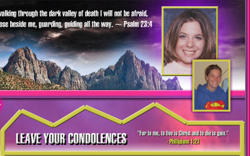 Comments: hey sis it has been quite a long time. you dont know how hard this has hit me. I went to camp last summer and all i could think about was you and so i did a devotion about you and it helped a lot of people. I just wish i could see you. I know that you are in a better place but sometimes it just doesnt seem fair but i know that it truly is. You were the best sister anyone could ask for and it was just amazing to watch the love that you had for everyone and God. i miss you so much and cant wait to see you again i love you. mark